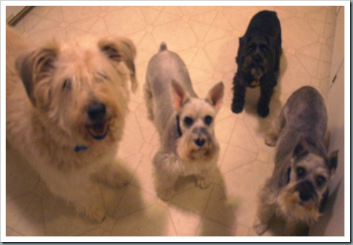 Perhaps it's just as well that the dogs have yet to realize their longed for nose-to-nose encounter with Spitty is within reach. They have been too busy begging for a bite of The Humans' Valentine's Day Fondue dinner.